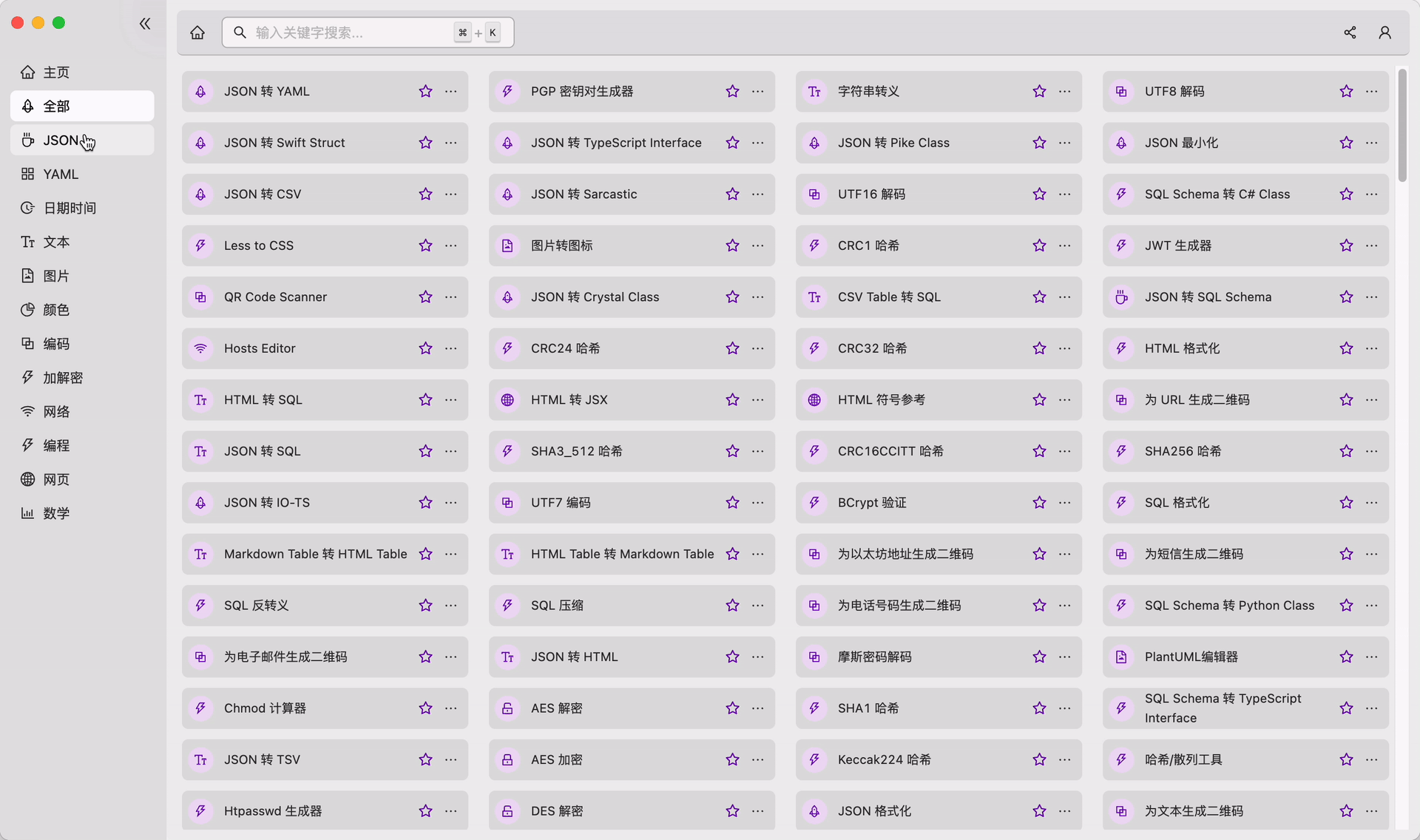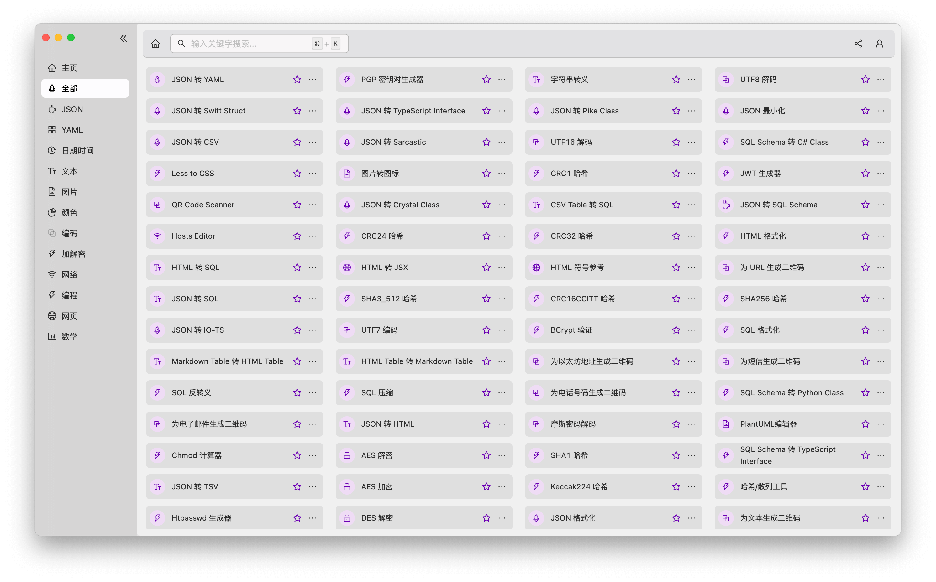 「He3 氦三开发工具箱」不仅完全免费,同时还跨平台支持 Windows、Mac、Linux 系统,它内置了超过 400 种实用的程序开发相关辅助工具,功能非常全面,囊括了 JSON、YAML、日期时间、文本、图片、颜色、编码、加解密、网络、编程、网页等大类,非常丰富。