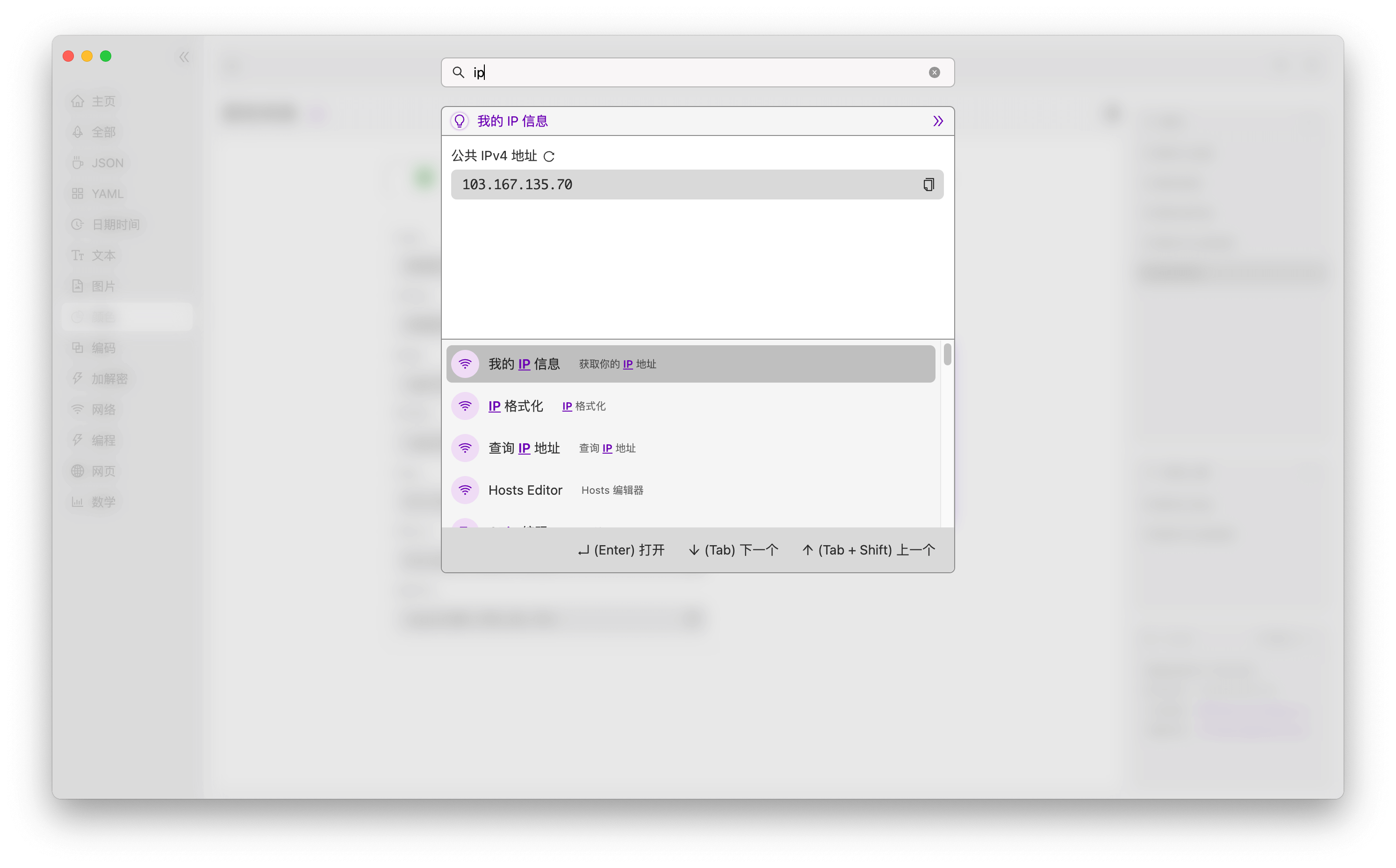 此外,很多工具还提供了搜索列表「预览结果」的功能,比如查询 IP 地址、查看当前时间戳、颜色生成器等工具时,它会直接在搜索列表里就显示出内容,你甚至都不必打开工具就能直接看到结果。