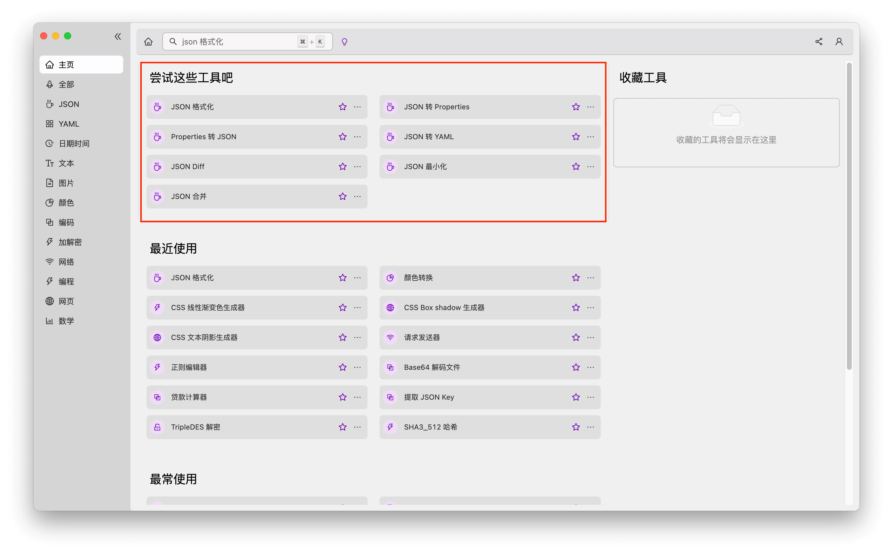由于收录的工具众多,因此 He3 还给用户提供了「个性化首页」,可以显示出用户最近使用过的、最常使用的,以及收藏过的工具,方便你更快地找到它们来使用。